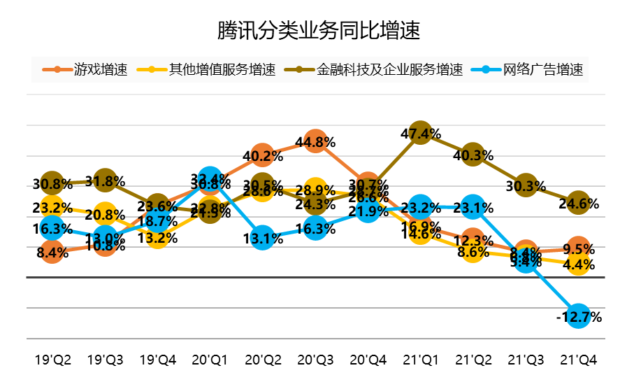 广告收入,在2021年中之前,一直还能保持两位数增速,但是最后的两个季度开始拉胯。需求放缓、监管的变化,都使得腾讯的社媒广告业务突然下降,Q4的媒体广告下降了25%,移动广告联盟也下降了10%。腾讯此前的一些广告主,也很多集中在教育、电商以及相关的互联网行业,这些行业的广告主自身面临的逆风更进一步降低了腾讯的广告收入能力。