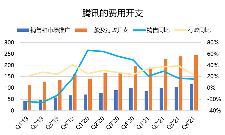 而视频增值业务上的游戏渠道成本提升、视频号内容分成提升,在短期内还是得维持现状。视频号在与抖音快手等短视频的竞争中依然没有获得足够优势,还不至于立马收紧开支。而游戏渠道成本,若是在版号停发的情况下,更需要多个季度的强力维持。包括在游戏赛事等市场投入上,腾讯依然不见得有能力收缩。这方面,腾讯还需要继续维持大量的市场和人力成本。