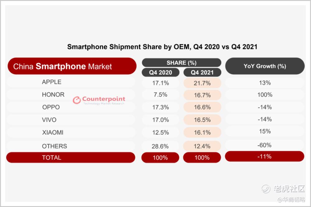 而市场,也开始加速回报那些扎根底层技术、厚积薄发的企业。Counterpoint Research的最新数据显示,2021年第四季度,苹果领衔国内手机市场,荣耀以16.7%的市场份额,跃居第二。