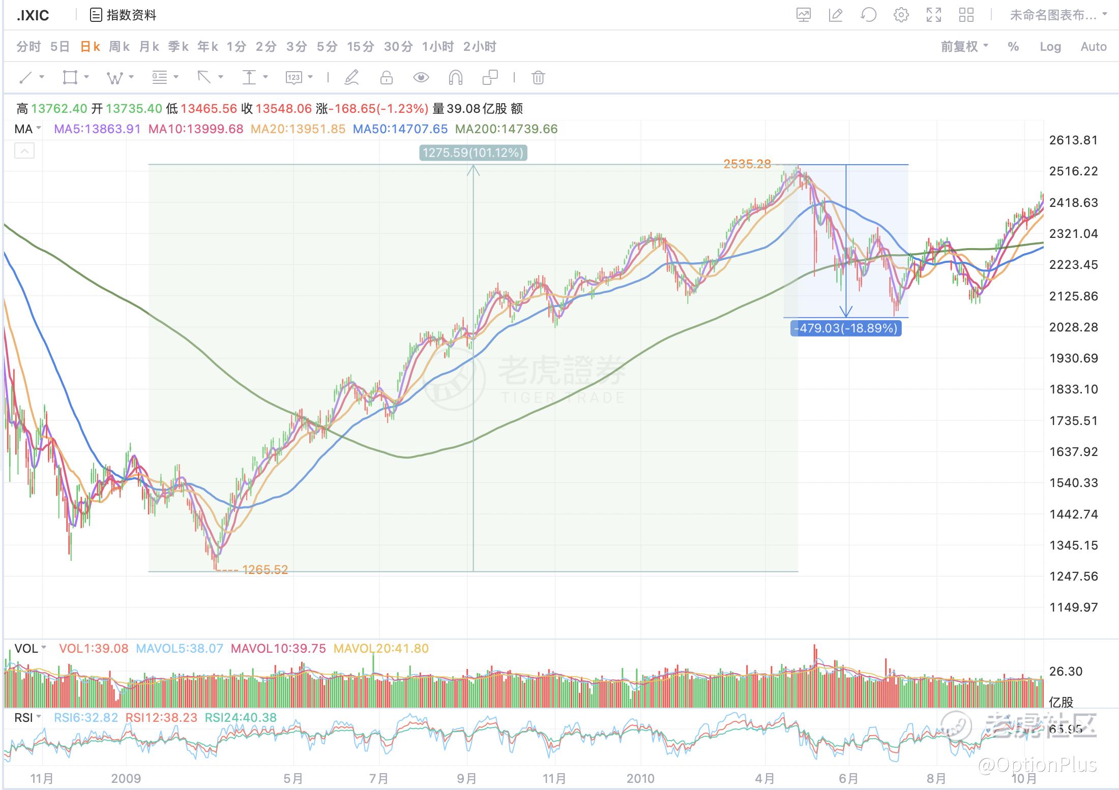 2010年的死叉出现在金融危机复苏后的一段非常壮观的拉升中,纳斯达克指从09年3月触底到2010年4月的阶段顶反弹了100%,然后出现回调,仅回调不到20%,死叉出现在第一个底之后。