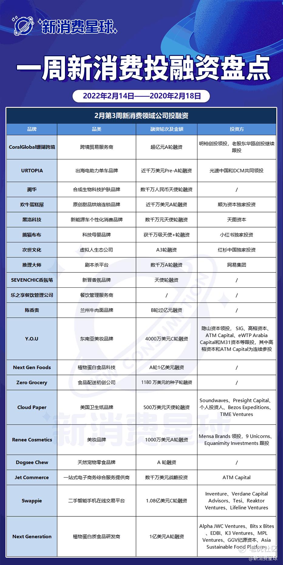 以下一周投融资复盘内容(2月14日至2月18日)由新消费星球整理: