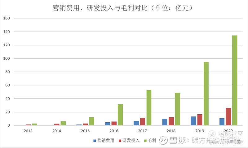 公司的发展主要靠内生增长,并没有发生较大的并购事件。而营销和研发是公司内生性增长的双引擎。2020年,公司取得毛利134.37亿元,投入研发25.91亿元,占毛利的比重为19.28%。