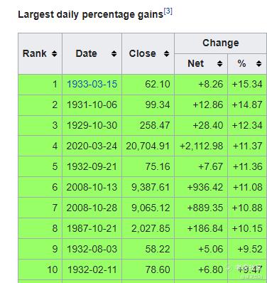 整个美国股票市场上百年的历史里,单日涨幅最高的十大交易日里,发生在大衰退的1931-1933年的有6次之多,而发生了次贷危机的2008年也占了2次,离我们最近的一次发生在2020年3月24日,相信大家还记得那时候发生过什么事情,因为疫情的黑天鹅事件,那一个月里美股发生了史诗级的4次熔断。具体数字可以参看下图。