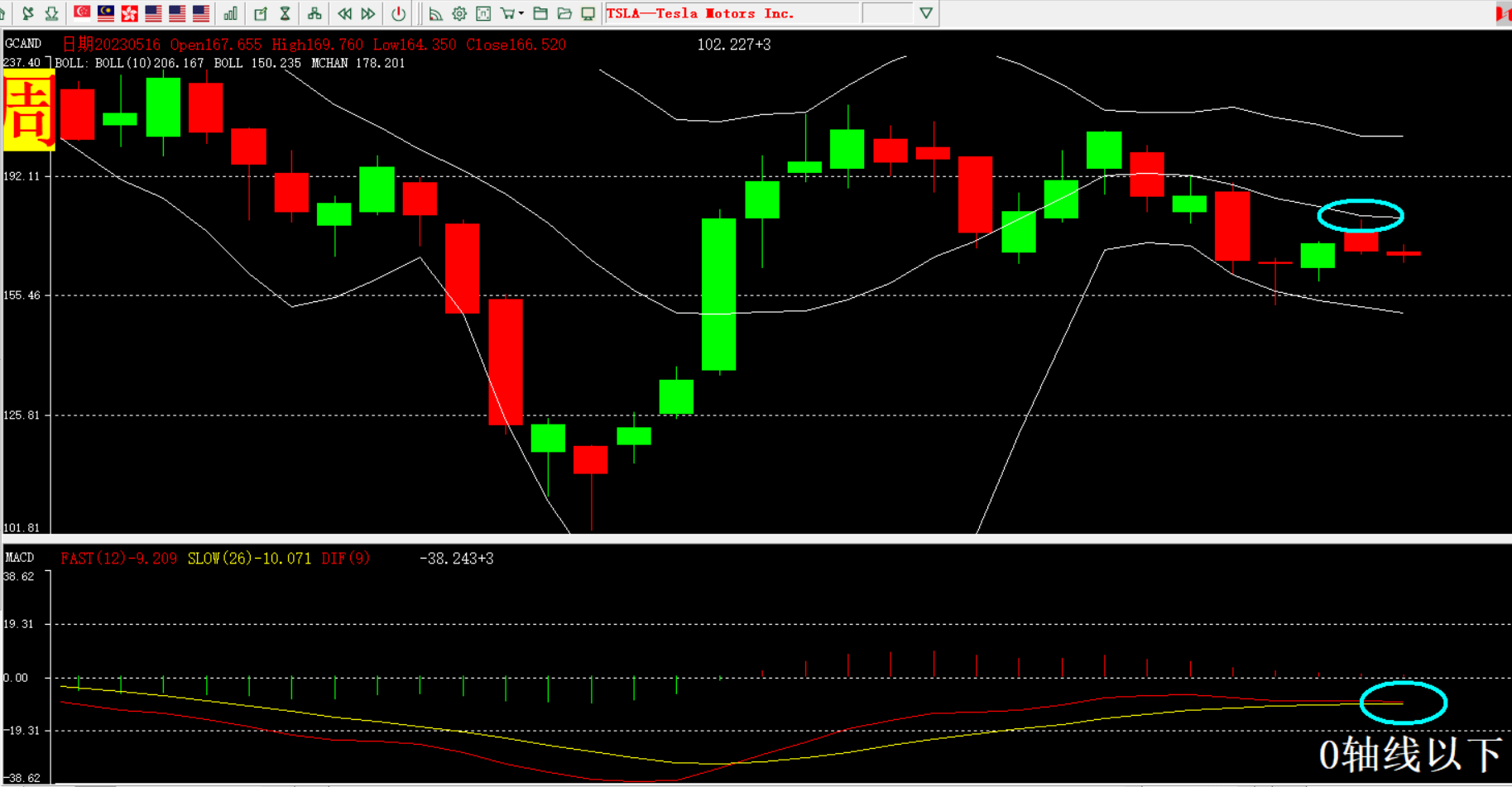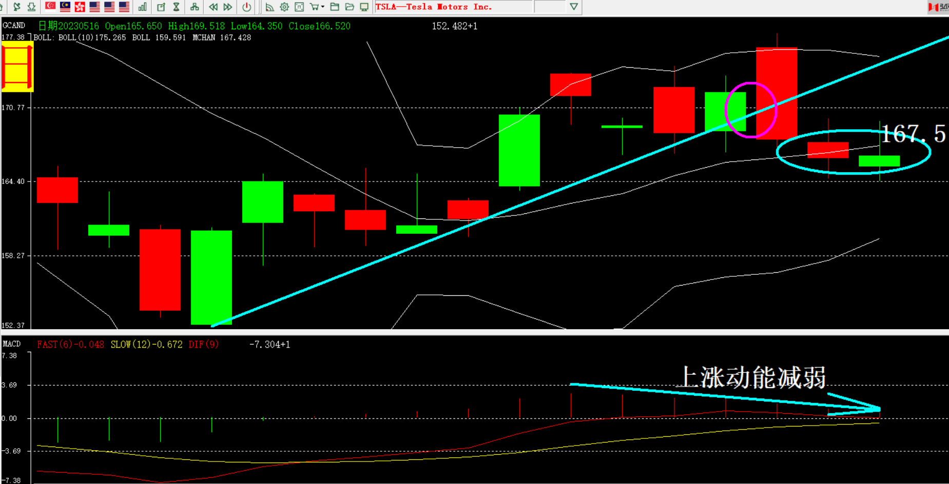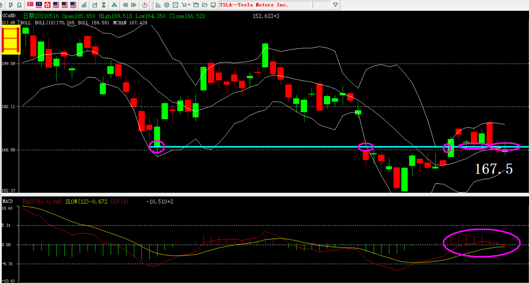 从特斯拉周线走势来看上周没突破布林线中轨,本周继续震荡,主要是因为MACD指标还在0轴以下,目前快线接近慢线,若再下跌容易死叉,