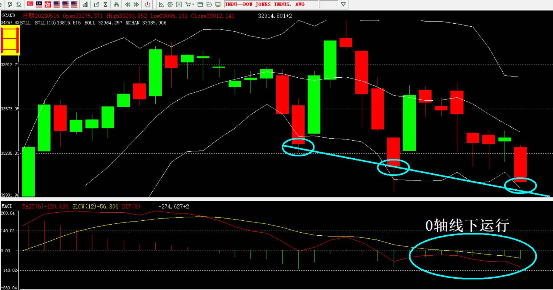 道指 指数到了关键的布林线下轨,前面两次到下轨就开始反弹了,但是反弹的力度在减小,所以这次即使反弹也不要预期太高,因为MACD已经破掉0轴,呈现空头排列。
