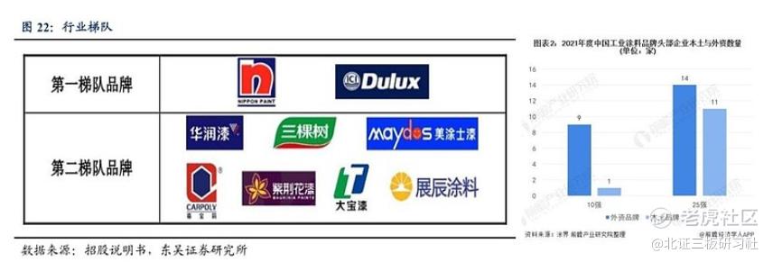 涂料市场,我国涂料行业目前的现状是头部企业仍以外资为主,呈现显著的梯队化特征,根据2021年9月国内涂料产业财经媒体《涂界》发布的“2021中国工业涂料品牌Top 25”榜单来看,排在前十位的企业中,外资企业占据了9席;排名前25的企业中,外资品牌占据了14席。处在第一梯队的多为立邦、阿克苏诺贝尔等跨国涂料集团;第二梯队是三棵树、广东华润、嘉宝莉、叶氏化工等专注国内市场并逐步做大做强的国内品牌企业;第三梯队是由大量的小型涂料厂构成,公司目前规模较小,处于第三梯队。