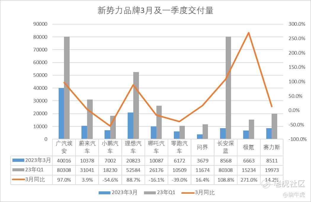 新势力品牌中,广汽埃安3月交付量已超过4万量,同比增长97%;一季度销量80308量,同比增长79%。2022年埃安累计销量27.1万辆,同比增长126%,为新势力车企销量第一。
