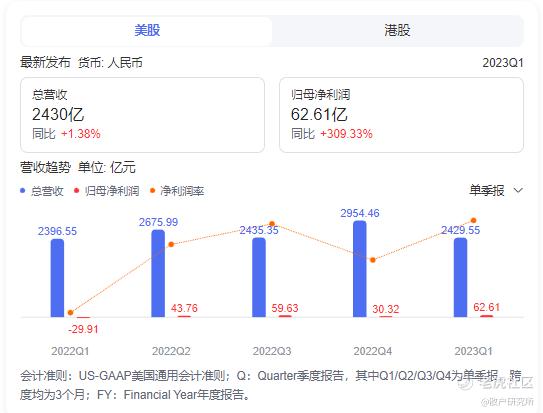 5月11日,京东集团公布了截至2023年3月31日的第一季度财报。财报显示,一季度京东收入为2430亿元,同比增加1.4%。归属于公司普通股股东的净利润为63亿元,去年同期为净亏损30亿元。