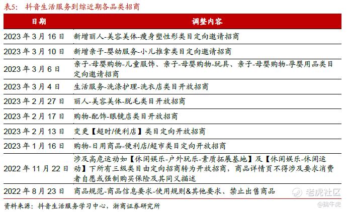 而抖音是在先拿到用户的情况下入局的,抖音用户量已有8亿,也能够相对容易拿捏到美团较难渗透的低线城市用户。用户更多是浏览视频时根据推荐激情下单,而并非针对特定的需求,尤其当匹配到旅游相关的打卡、周边及票务、丽人、亲子等场景时,下单概率相比美团很有优势。目前抖音迅速开放了众多细分品类的到店招商,对商家而言,入驻抖音的同时兼具营销作用,投流也更方便。