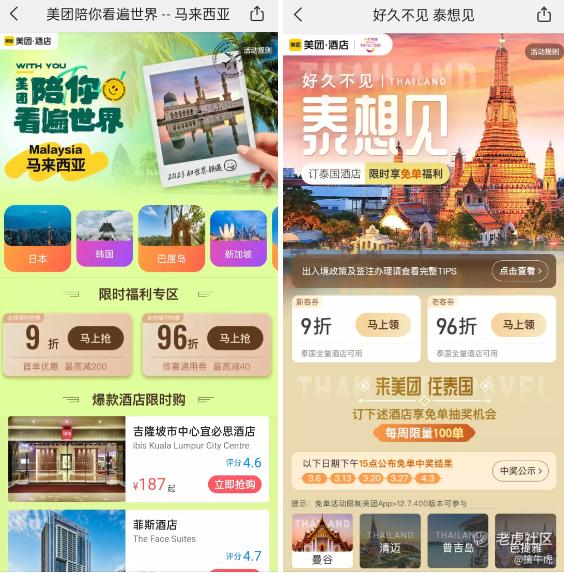 首先是旅游相关的酒店业务。从去年12月解除管控后,旅游需求及酒店订单量迅速回升,今年旅游业即将强劲复苏,境内游、出境游需求在4-5月将出现高峰。美团财报表示对境内旅游行业未来增长充满信心,同时,平台也在为5月假期旅游需求做运营预热。在美团酒店页面,美团也推出了泰国和亚洲热门出境游地区的专题页面,主打酒店预订、旅游攻略,还在3月推出免单抽奖活动、限时折扣来拉新,并提供辅助出境的官方信息助手,尽可能全面地提供一站式服务。