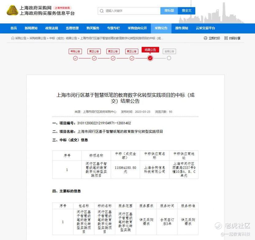 3月23日,上海市闵行区教育学院基于智慧纸笔的教育数字化转型实践项目发布了中标通知。 $一起教育科技(YQ)$(上海合煦信息科技有限公司)受到全国智慧教育示范区闵行区的认可成功中标,项目金额115,964,180.80元。