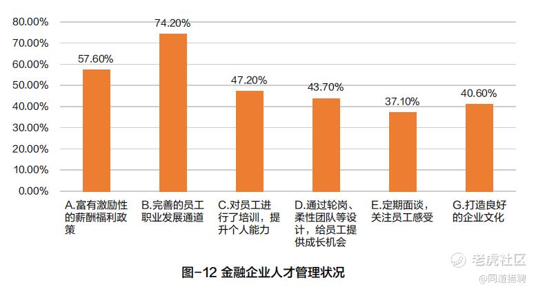 金融业员工对中国金融企业在人才管理上的期望与德勤的研究具有重合的地方。首先,员工最重视的是完善员工职业发展通道(74.20%)。金融企业规模大、人才多,内部晋升竞争激烈,设计并打通多个职业发展通道,才有利于不同特点的人才充分发挥自己的优势。其次,员工非常重视富有激励性的薪酬福利政策(57.60%)。薪酬福利既是员工个人价值的体现,也是保证员工体面生活的保障,员工也给予了高度的关注。第三,员工关注对员工进行培训,提升个人能力(47.20%)。系统的培训对于员工的职业发展、个人能力提升都具有重要作用,也是员工非常关注的方面。第四,其他员工比较关注的方面包括:通过轮岗、软性团队等设计,给员工提供成长机会(43.70%)、打造良好的企业文化(40.60%)、定期面谈并关注员工感受(37.10%)。