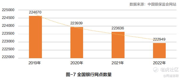 截止2022年6月3日,保险代理人持续减少,相对于2019年的912万的总量,2022年减少了400万,而2022年保费收入同比增长4.58%,达到4.7万亿;2022年,中国银行业网点数量持续减少,2022年全国网点共减少687个,银行柜员数量减少约3万人,智能柜台、智能设备持续增加,提高了业务办理效率。相对而言,业务操作人员数量和网点的减少,对业务增长影响有限,可见,数字化转型提升了金融业的整体经营效率。