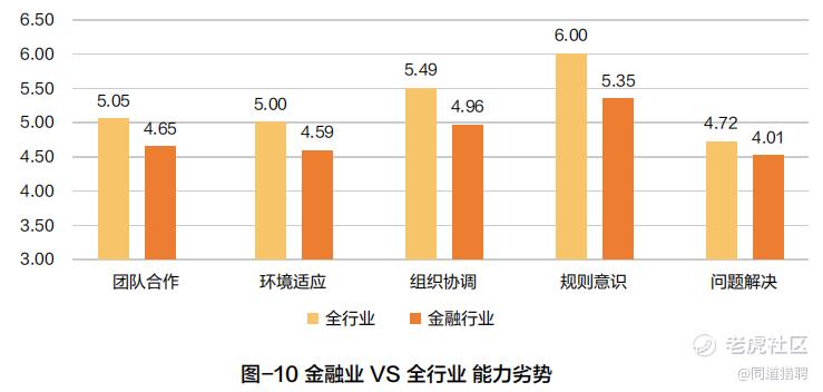 金融业人才在团队合作(4.65)、环境适应(4.59)、组织协调(4.96)、规则意识(5.35)、问题解决(4.01)这五个维度显著低于全行业水平。体现出金融业因为在强监管之下,更看重组织整体和业务流程的管理能力,而弱化了个人的组织管理能力,有必要加强个人在组织管理能力上的培养,促进个人管理能力的提升。