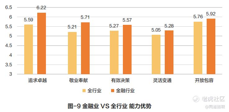 金融业人才在追求卓越(6.22)、敬业奉献(5.71)、有效决策(5.57)、灵活变通(5.28)、开放包容(5.92)这五个职业能力上得分显著高于全行业水平,体现出金融业人才的个人职业素养普遍非常高,也是金融业的特殊性对人才发展的要求。