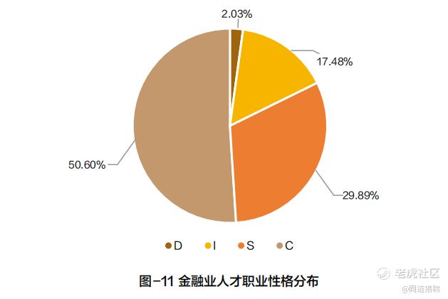 将金融业与全行业的职业性格类型分布进行对比,可以发现金融业具有比较显著的差异。D型的人才明显偏少,C型的人才相对较少,而I型和S型的人才明显更高。这个的职业性格分布使金融业人才整体以稳健、谨慎的风格为主,关注流程的合规性和风险控制,符合金融业高风险、强管控的行业特点对人才的要求。可见,金融业总体上符合中国职业人群的类型特点,但又呈现出明显的行业特点。