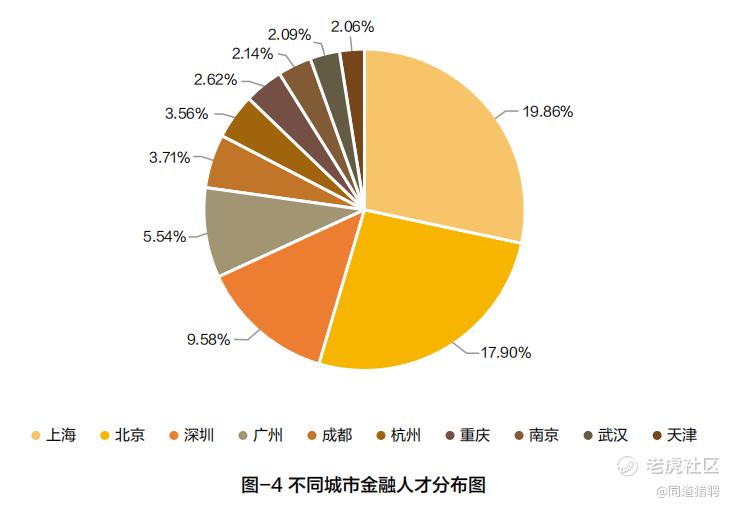 (4)北上广深四个城市吸引了超过全国半数以上的金融人才,上海对金融人才的吸引力超过北京,成都和杭州成为金融业人才聚集地的后起之秀;
