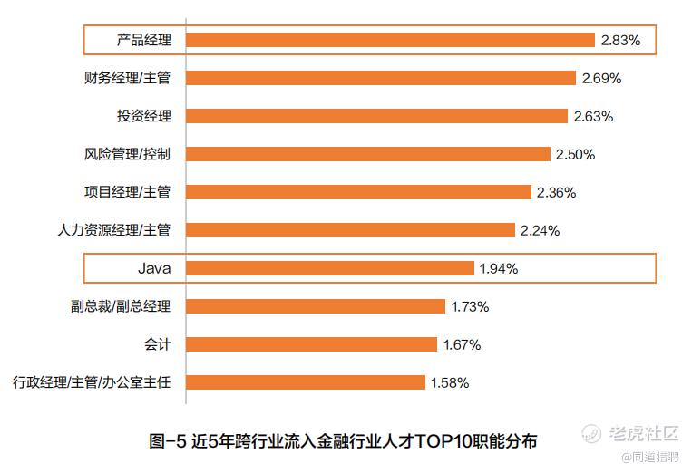 (5)数字化转型持续影响金融业人才结构,产品经理高居人才流入占比的第一位,JAVA开发方面人才流入占也比较高,且呈持续增长的态势;