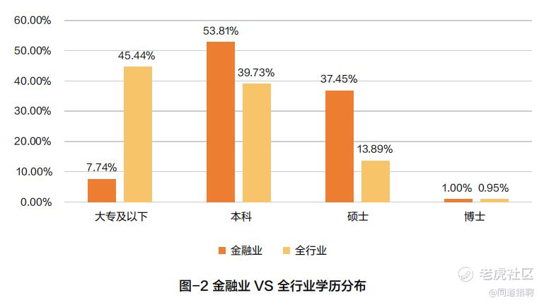目前,本科学历几乎是进入金融业的基本门槛。同时,大量具有硕士及以上学历的年轻人才投身到金融行业之中,具有硕士和博士的高学历人才占比远高于其他行业,达到38.45%。