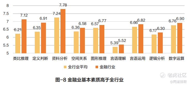 无论是在校园招聘和社会招聘,还是内部人才盘点中,金融业人才在行政能力倾向测验中都获得了高于全行业的分值,尤其是在类比推理(7.12)、定义判断(6.91)、资料分析(7.78))、空间关系(6.58)的得分都显著高于全行业平均水平,而在图形推理(6.77)、言语理解(5.52)、言语运用(6.82)、逻辑分析(6.30)、数字运算(6.90)的得分也都高于全行业平均水平。体现了金融业在校园招聘、社会招聘中都具有很强的吸引力,能够吸收校园和社会的优秀人才加入到行业当中。