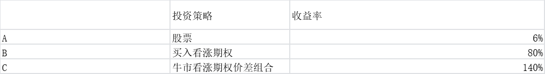 以上策略实操效果如何呢?举个例子,假如现在有ABC三位投资者,一个月后特斯拉披露财务数据A认为一个月后特斯拉股价会涨,但是无法预测涨幅C认为一个月后特斯拉股价会涨5%以上D认为一个月后特斯拉股价会涨5%-10%如果都是买股票,假如一个月后特斯拉股票涨了6%,那么四个投资者的收益率相同,都是6%,但是聪明人通过期权策略那就完全不一样了,假如 A 选择直接持有特斯拉股票,B买入看涨期权,C采用牛市看涨期权价差组合,那么三者的收益率如下: