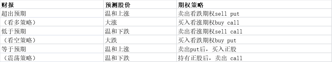 通过上面的例子不难发现,最能影响期权价格变动的因素就是底层资产,对于股票期权来说,当财报数据披露之后会导致股价发生变动,从而导致期权价格发生变动。因此,财报季的期权赚钱策略主要有以下几种: