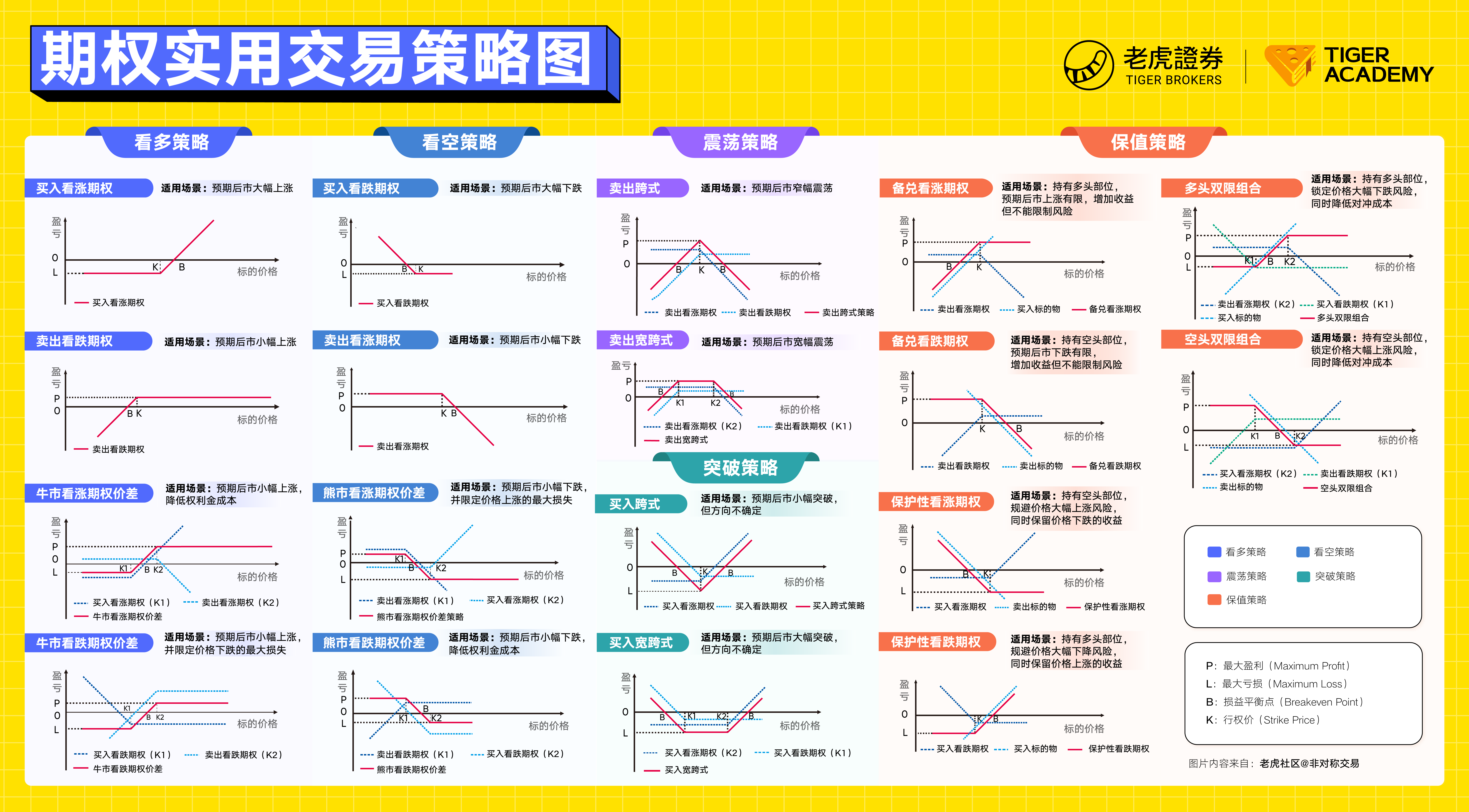 看到下面这张图了吗?如何在不同的场景下选择更多合适的期权策略呢?后面的内容,芝士虎会带你学习来逐一搞定 。