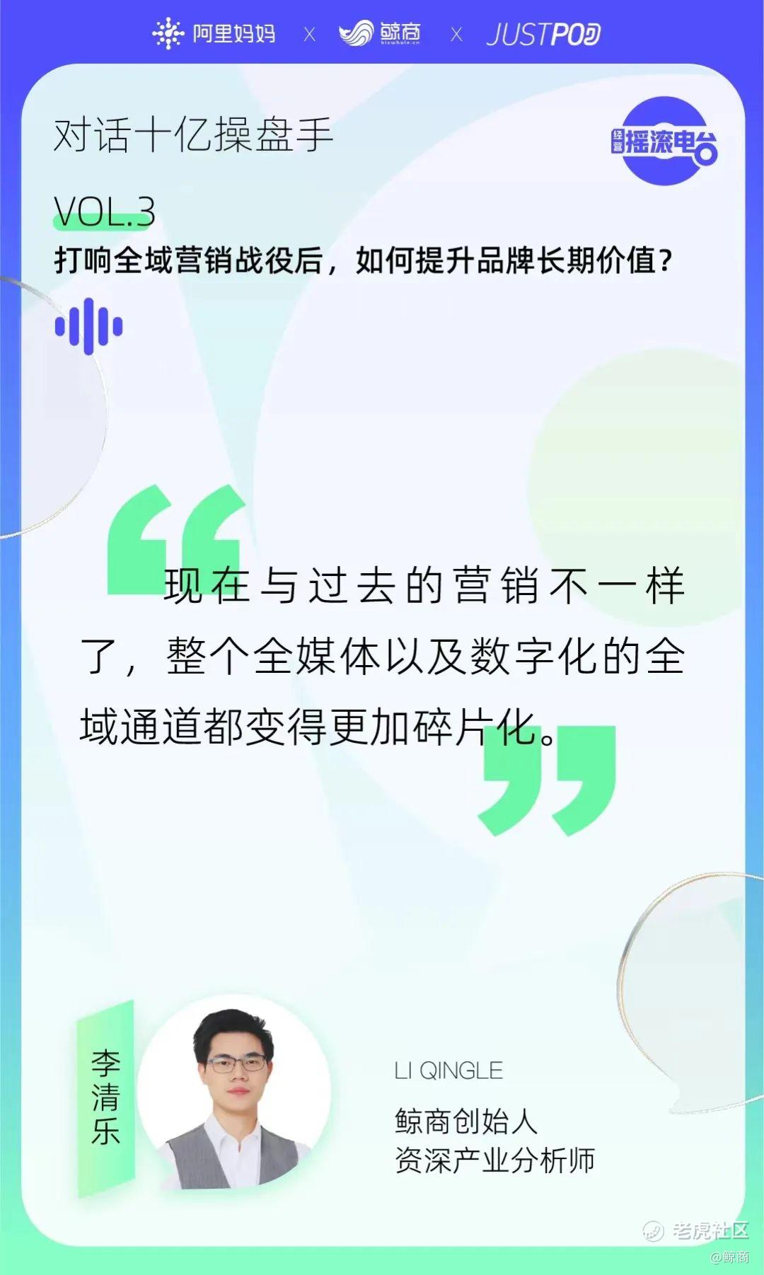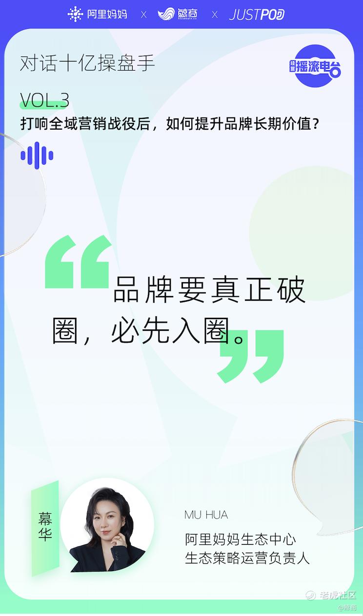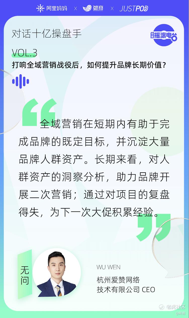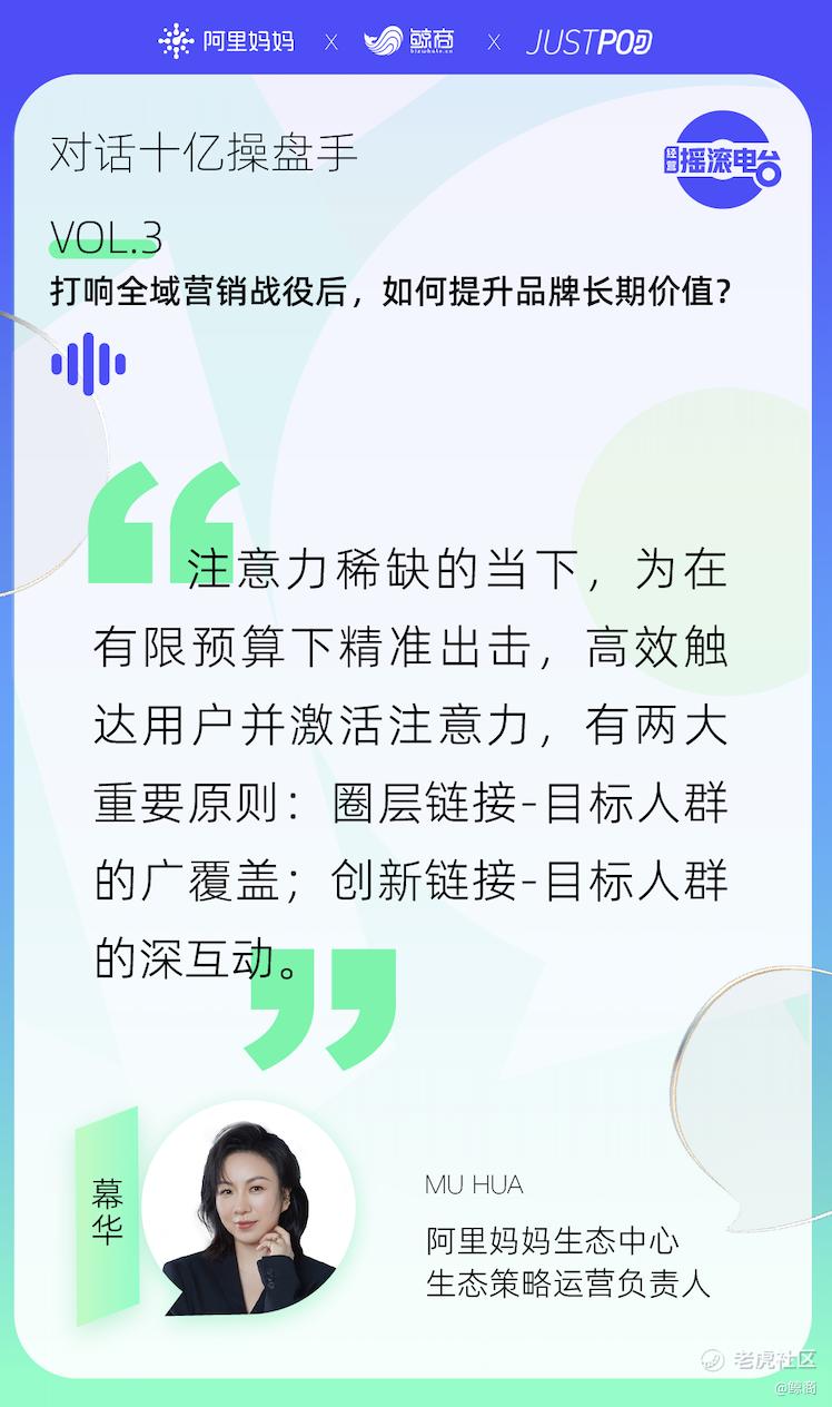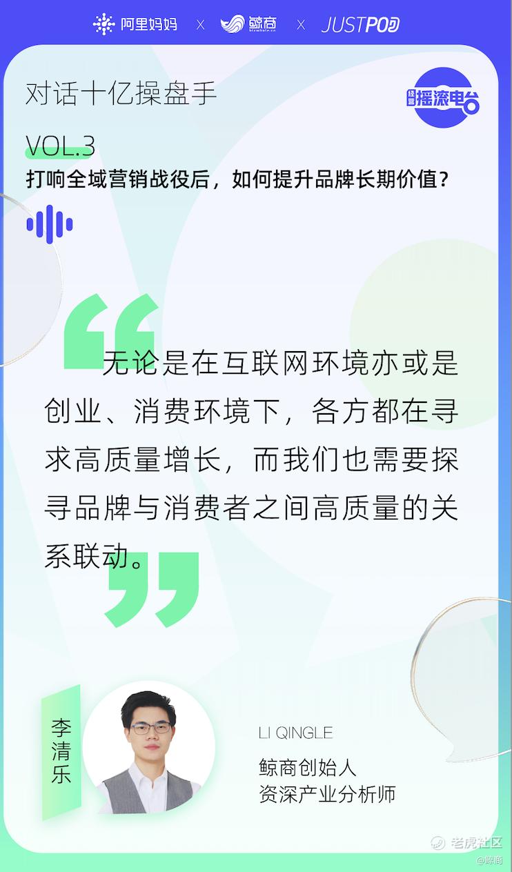 8月,阿里妈妈“经营摇滚电台”栏目推出“对话十亿操盘手”专题,第三期聚焦品牌出圈和全域营销话题,邀请阿里妈妈生态伙伴杭州爱赞网络技术有限公司CEO无问、阿里妈妈生态中心生态策略运营负责人幕华,与阿里妈妈特邀主持人鲸商创始人及资深产业分析师李清乐,从实际操盘案例和观察见证十亿曝光的视角,探讨和挖掘更多的商业财富,解码2022年利好的平台策略玩法。