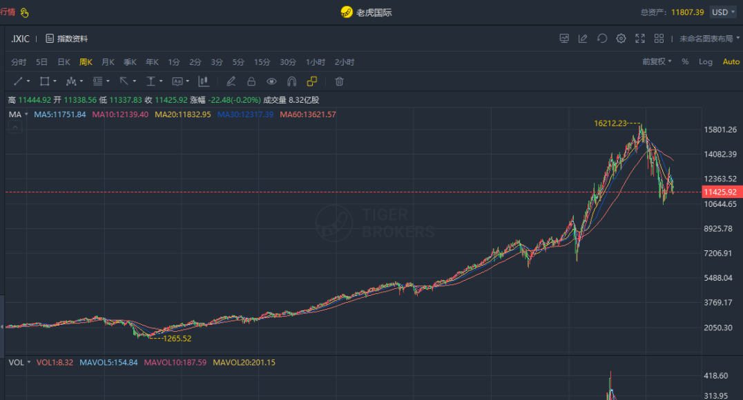 第五2021年11月起,全球通胀,从16000点跌至11400点28%
