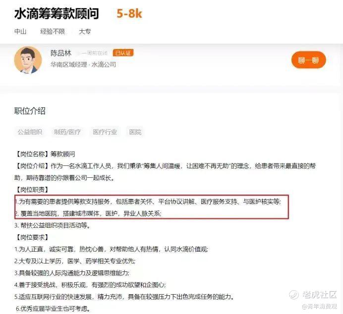 除此之外,水滴筹还要展开地推。央视曾经曝光,水滴筹派业务专员进行扫楼,通过扫楼的方式让病人及家属在水滴筹平台发布求助信息。