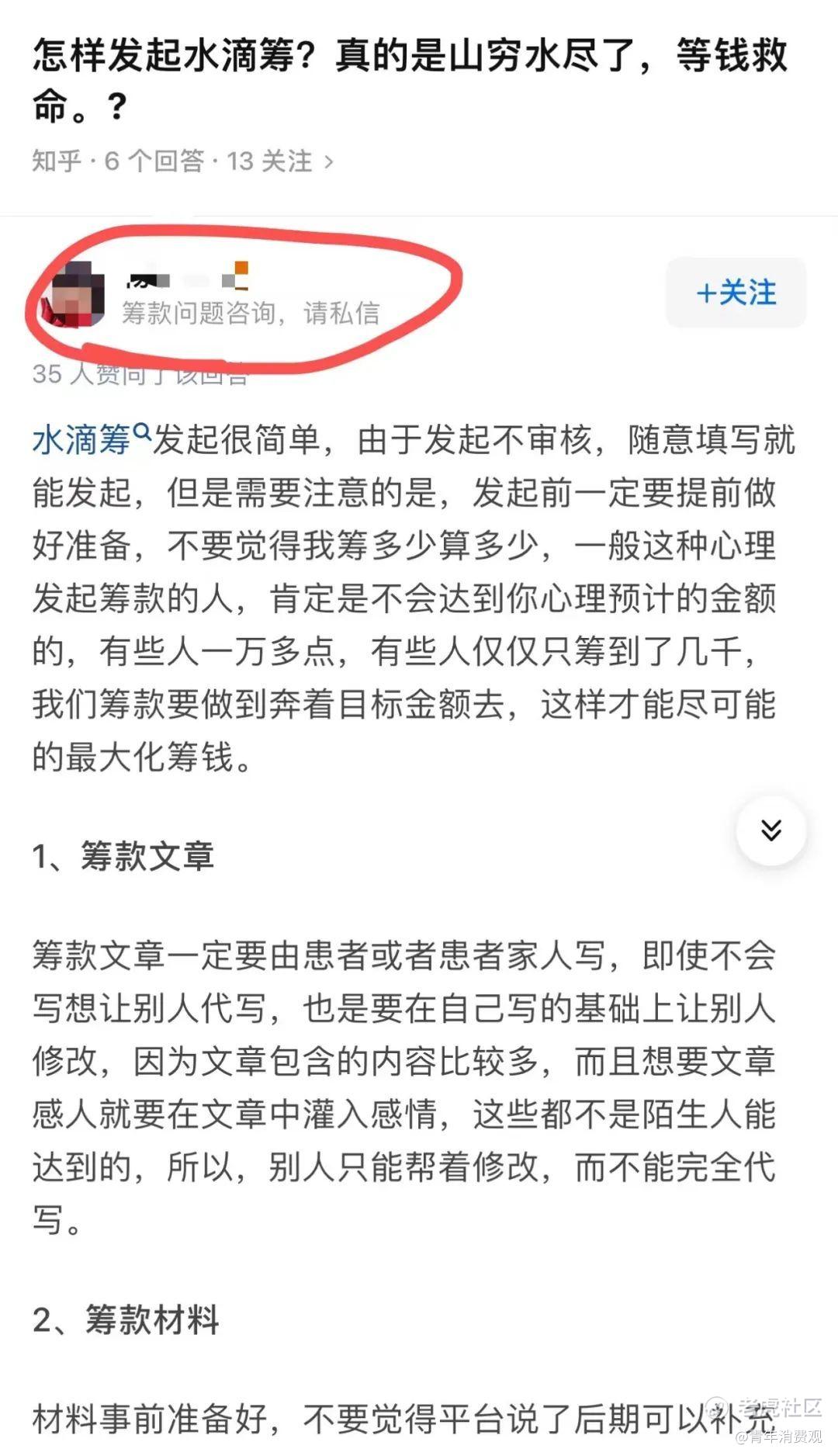 在知乎平台上,搜索“水滴筹”三个字,其中一些“好心人”的回答赫然在列,他们帮助那些文化水平较低,写不出感动朋友圈文案的人;帮助那些从农村来没有医疗保险,更没有商业保险,看不起病的人;帮助那些没有被纳入医保罕见病的病人家属......