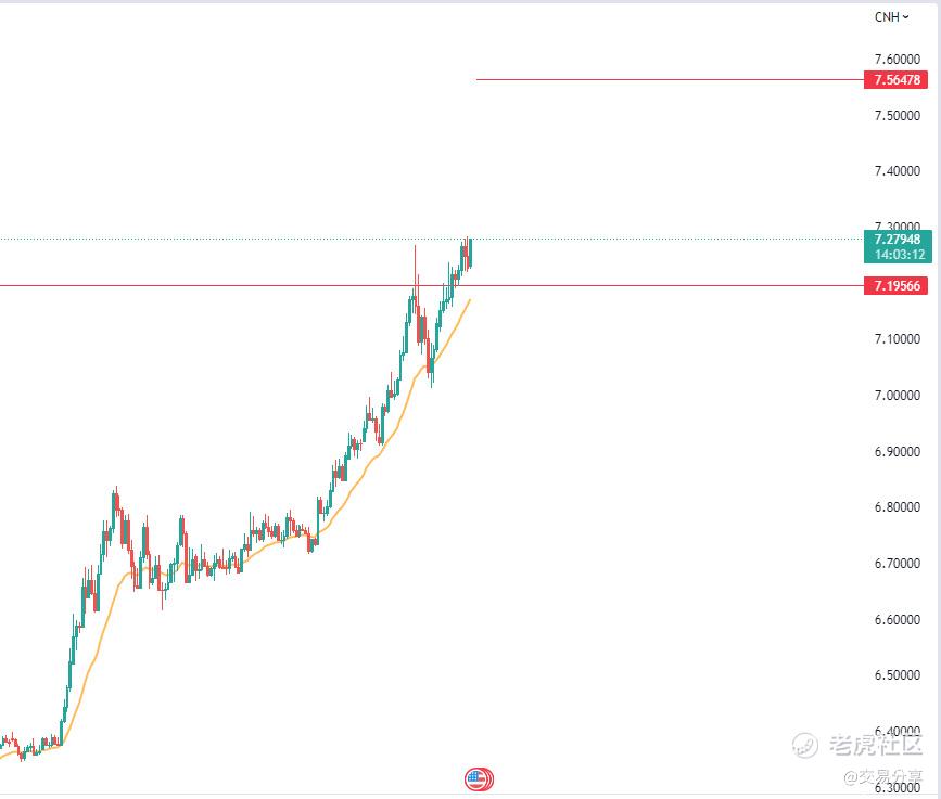 人民币继续突破,趋势一旦形成,很难逆转,即使央行喊的再大声也没用,7.56只是一个短期可以预测的位置,周线上来看没有任何可以参考的点位