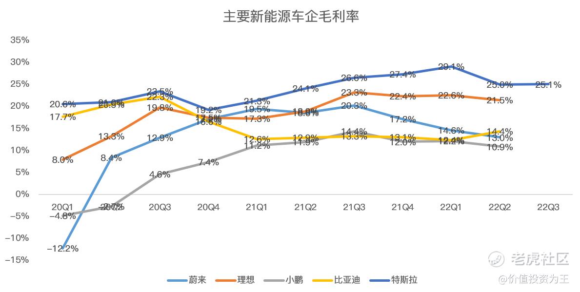 今年三季度,特斯拉的毛利率高达25%,远高于蔚小理和比亚迪,遑论零跑的负毛利率了: