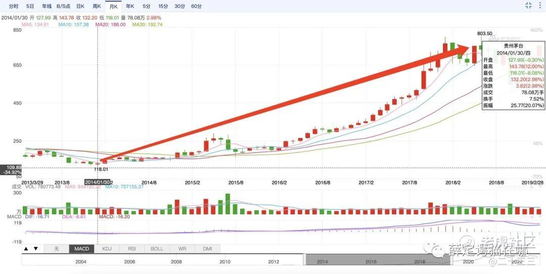 茅台一路向前,三年多时间,股价从100多涨到了800多,而且中间还10送1,不断高额派息,算起来从低点涨了有10倍。腾讯现在7倍市盈率,有点类似那时的茅台,不过不利于腾讯的是,彼时茅台才1000亿多亿人民币,现在腾讯虽然下跌了,但依然是2万亿港币的巨无霸。