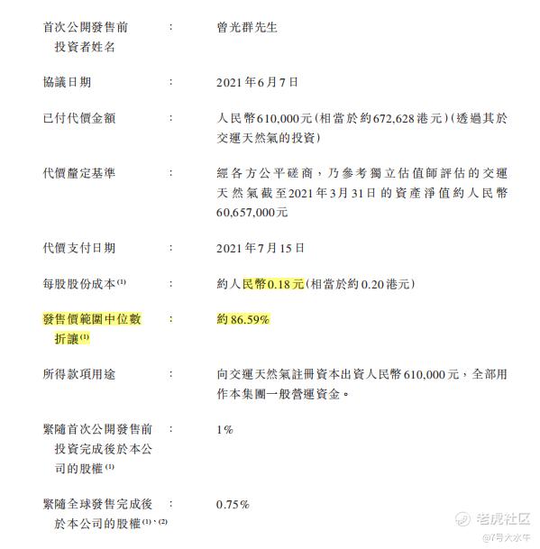 于2021年6月向曾光群先生发售股分,较中间价折让约86.59%,无禁售期。