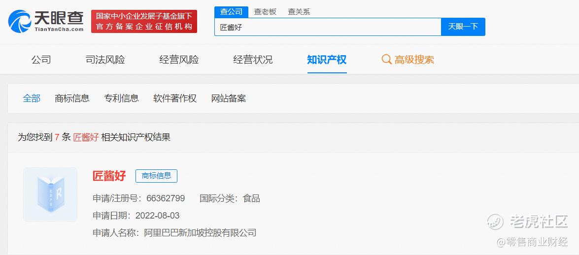 11月8日,天眼查消息称,阿里巴巴新加坡控股有限公司于近期已申请注册“匠酱好”商标,国际分类包括方便食品、食品,当前商标状态均为等待实质审查。