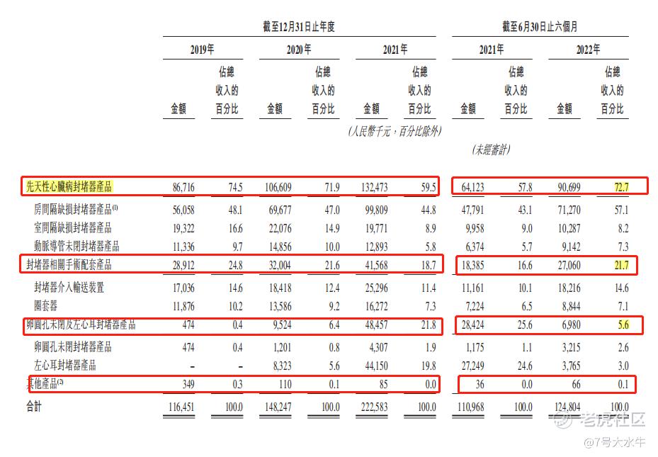 公司主要收入来自于先天性心脏病封堵器产品,2022年前6个月这款产品占总收入的72.7%,其次是封堵器手术配套产品占总收入的21.7%。