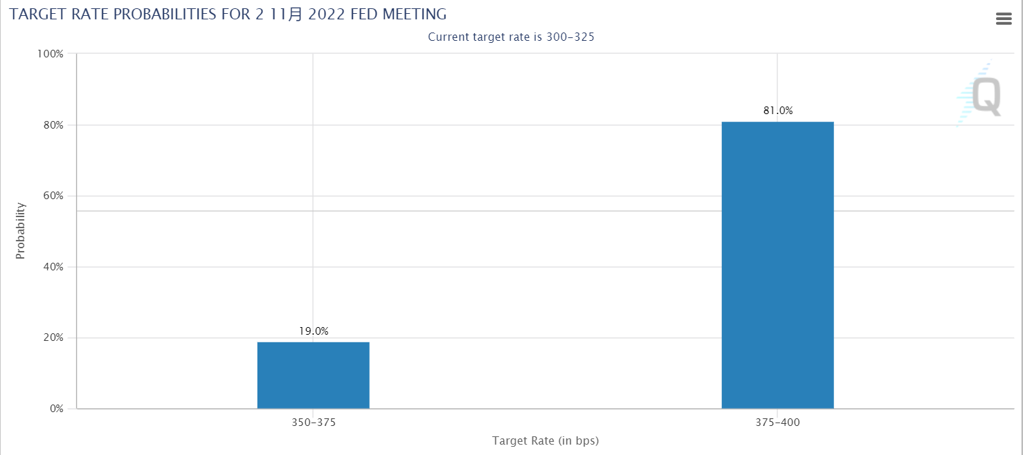 目前来看按,至明年2月达到高点可能性很高,这意味着在11月75个基点之后,美联储还有两次加息会议去满足100个基点的空间。因此,12月的加息就至关重要。如果12月加息75个基点,则明年2月则是25个基点;如果12月50个基点,明年2月则是50个基点。