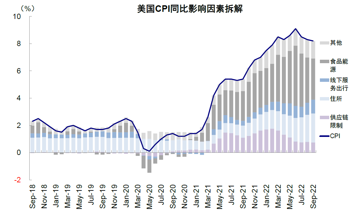 从CPI的历史变化趋势来看,食品和能源项目其实已经在8月开始降低了,供应链的问题也早在5月之后缓解。现在CPI居高不下的主要因子,是加息之后带来的服务项。