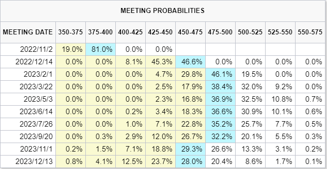 美联储的议息决定,都是根据最近的数据来进行的。因为9月的通胀依然超出市场预期(9月CPI数据分析),市场依然激进计价“加息”。