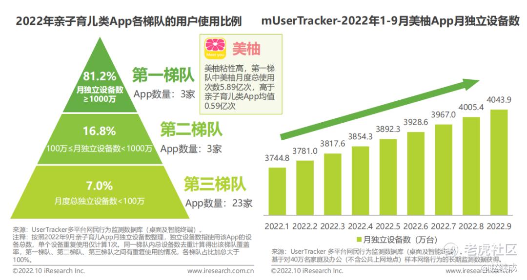 在美柚平台,月活设备数4000万,月度总使用次数5.89亿次,活跃用户数占母婴亲子类APP的53.7%,3.6亿女性用户,十个妈妈近七个在用美柚……这些数据都证明,美柚处在母婴APP赛道里的绝对头部和第一梯队,是真正的“隐形冠军”。