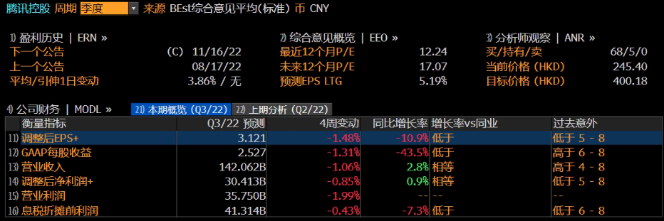 $腾讯控股(00700)$ 将于北京时间11月16日(周三)收盘后发布截至2022年9月30日止季度业绩。腾讯三大主业有喜有忧:游戏、广告或承压, 金融科技等领域表现可圈可点;机构“唱多”,Q3利润率有望环比继续向好;彭博预计Q3营收为1420.62亿元人民币,调整后净利润为304.13亿元人民币。
