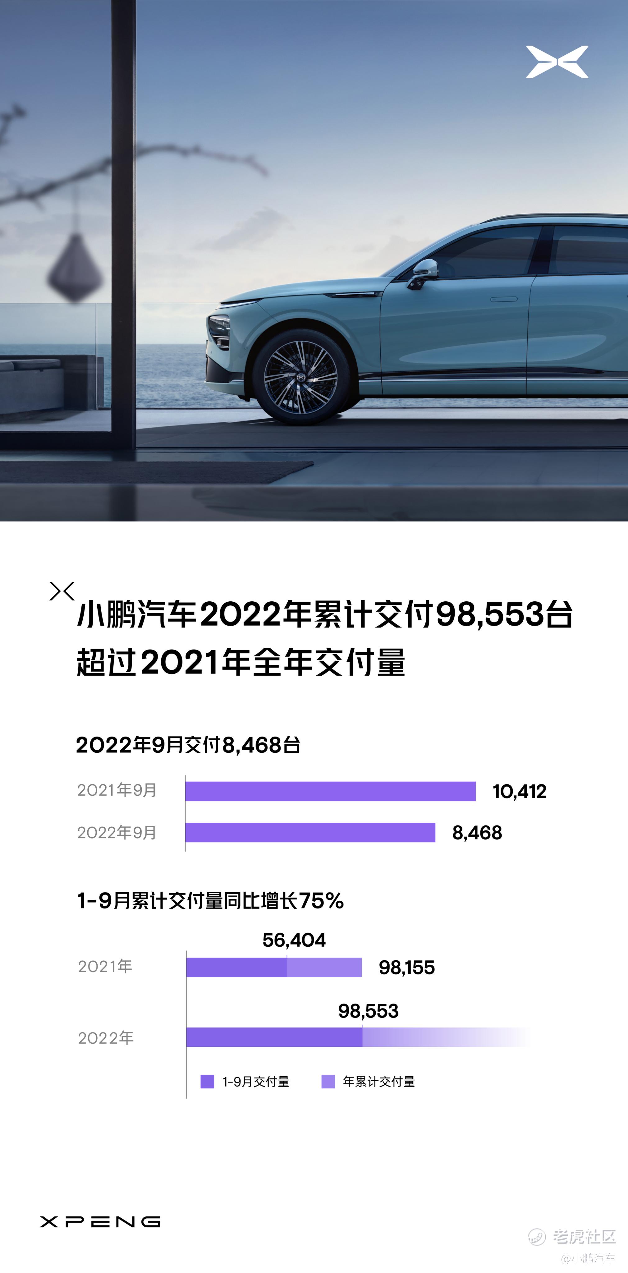 2022年10月1日,我们公布最新交付成绩。2022年9月,小鹏汽车总交付8,468台。其中,小鹏P7交付4,634台,小鹏P5交付2,417台,小鹏G3i交付1,233台。三季度小鹏汽车总交付29,570台,同比增长15%。今年1-9月,小鹏汽车已累计交付98,553台,同比增长75%,超过2021年全年交付量。