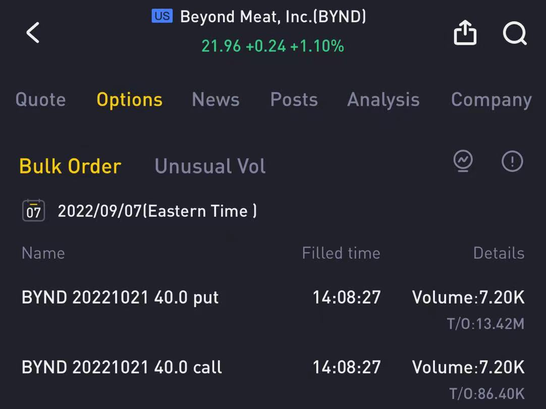 $Beyond Meat, Inc.(BYND)$ :跨式大单,put为深度价内。可能有雷,建议回避或者买彩票。$BYND 20221021 40.0 PUT$