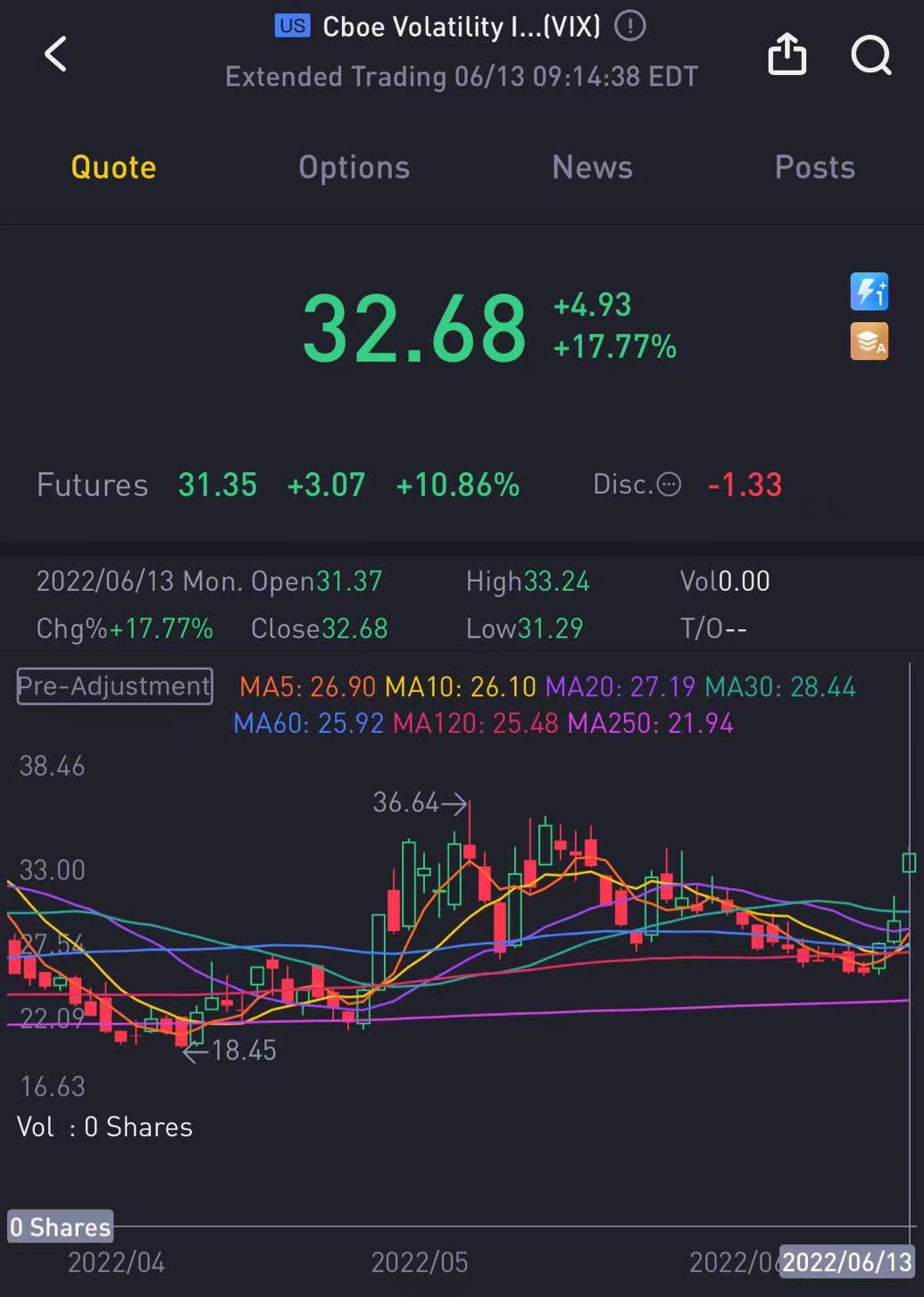 2是$标普500波动率指数(VIX)$ ,市场恐慌情绪的最佳反馈。通常来说VIX达到36之后市场就会反弹。今天盘前VIX涨到了33。而通过之前的观察可以发现,VIX涨的越快回落的就越快,尤其是一日内突破30,反而可以快速见底。周五延续周一的这次大跌主要是因为五月CPI数据再次爆表,同比增长8.6%,预期增长8.3%。数据公布后我反思了两点:没有对CPI数据下判断,也没有提前埋伏VIX。