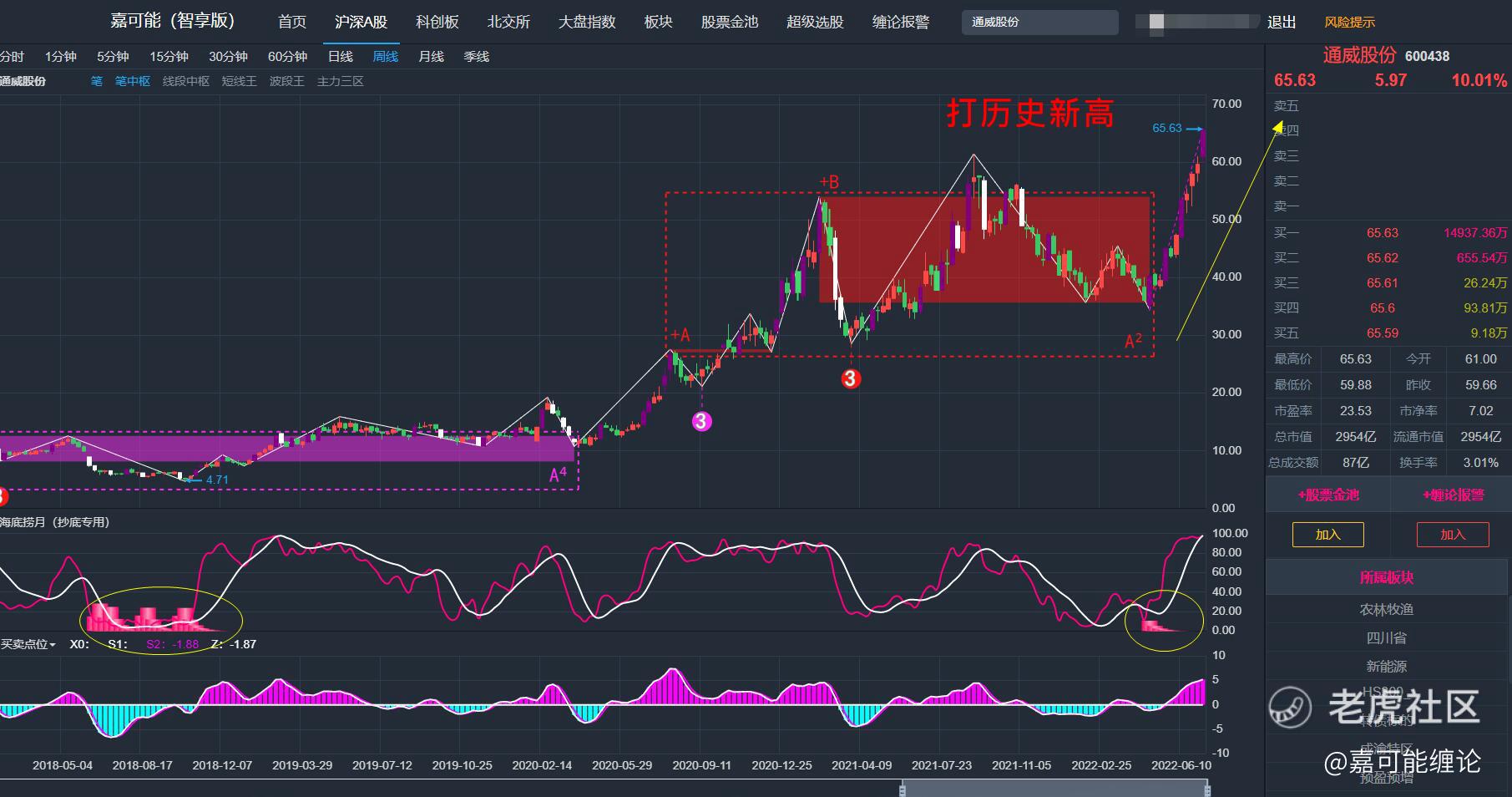 通威股份是打了历史性新高的。这对于整个板块概念来说,属于一种打开上涨空间的示范,意义重大。