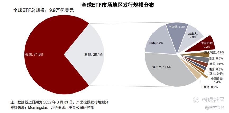截至2022年3月31日,全球ETF总规模将近10万亿,其中美国ETF占71.6%,而中国内地市场ETF规模仅占2.2%。