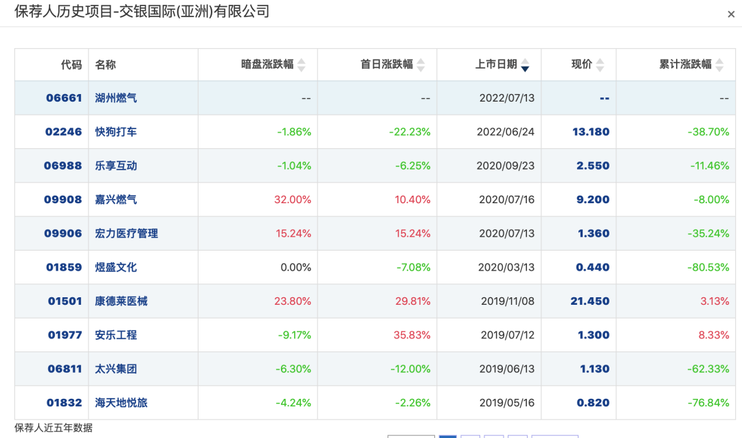 交银国际不怎么样,单独保荐记录少,表现也不怎么样!