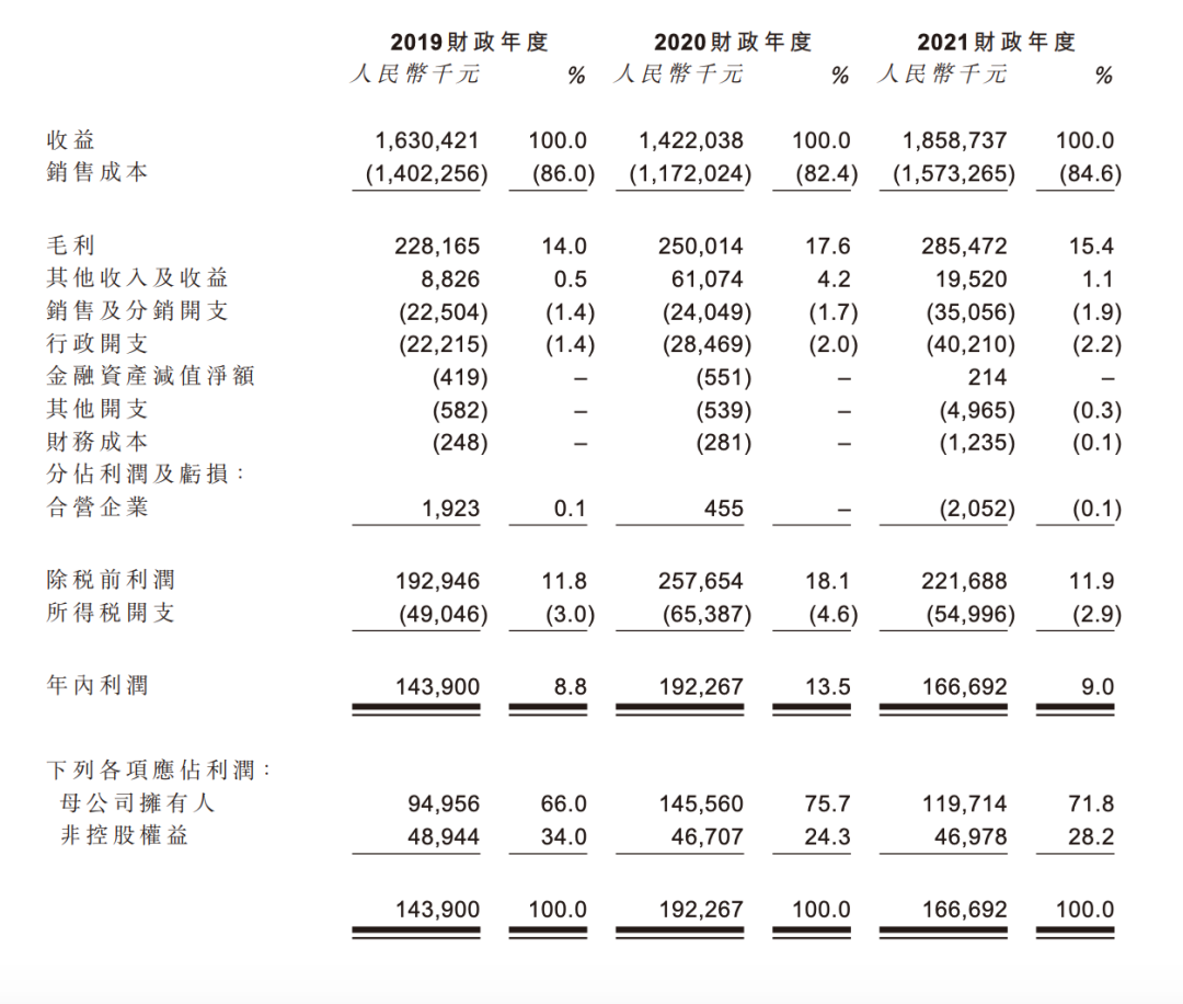 - 19至21年经调整纯利分别为1.43亿人民币、1.96亿人民币、1.76亿人民币(若不涉及上市开支)