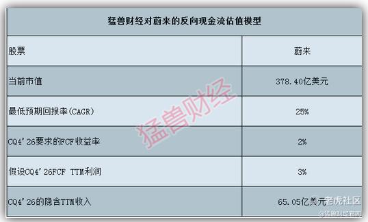 根据我们的反向现金流模型,我们认为蔚来不太可能以目前的估值在 CQ4'26 之前实现TTM收入达到65.05亿美元的目标。